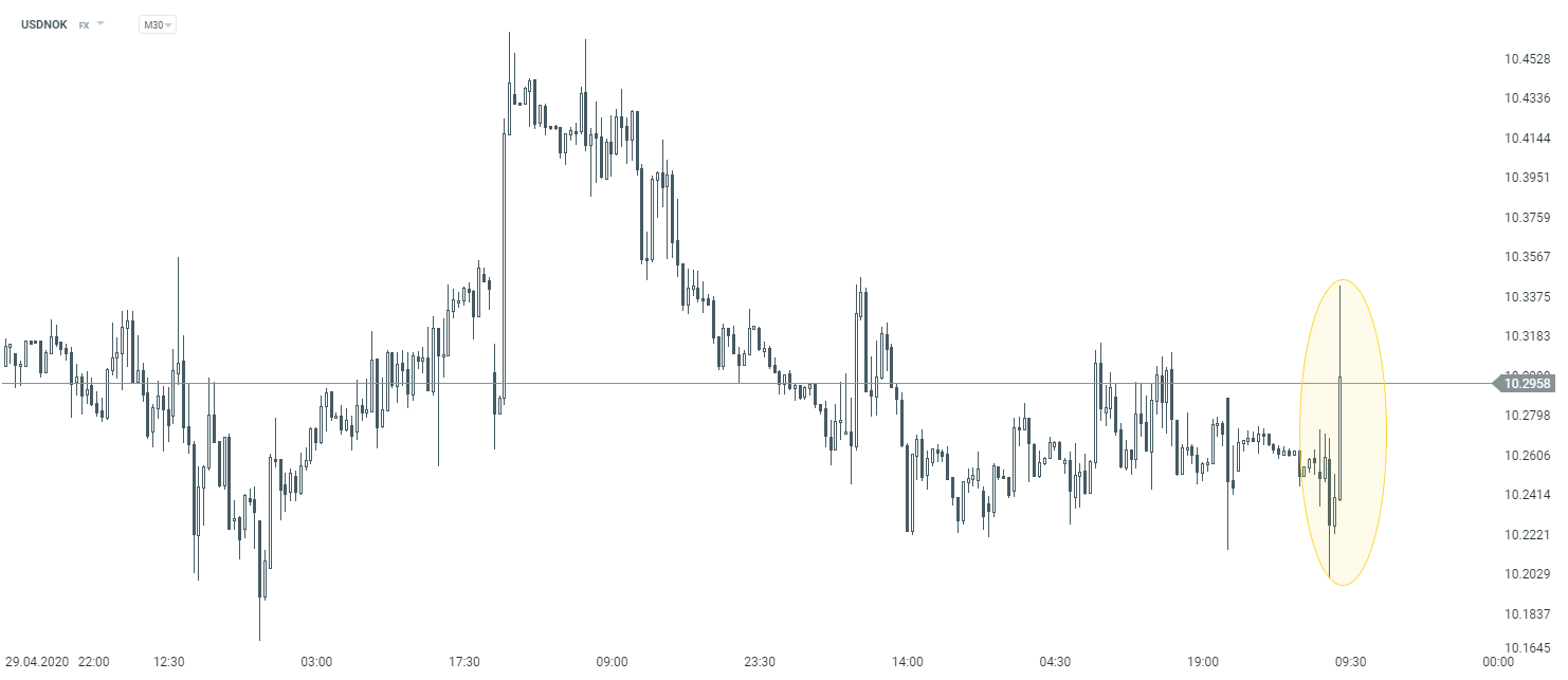 Norges Bank (Bank Centralny Norwegii) zdecydował się na cięcie stóp procentowych z 0,25% do 0,00%. Taki ruch jest zaskoczeniem dla rynku, ponieważ inwestorzy oczekiwali utrzymania ich poziomu. Jak powiedział prezes banku, Øystein Olsen, biorąc pod uwagę aktualne ryzyka, stopa pozostanie na obecnym poziomie prawdopodobnie przez dłuższy czas. W komunikacie możemy przeczytać, że bank spodziewa się ożywenia działalności gospodarczej, jednak musi minąć "trochę" czasu zanim podukcja i zatrudnienie wrócą do poziomu sprzed pandemii.