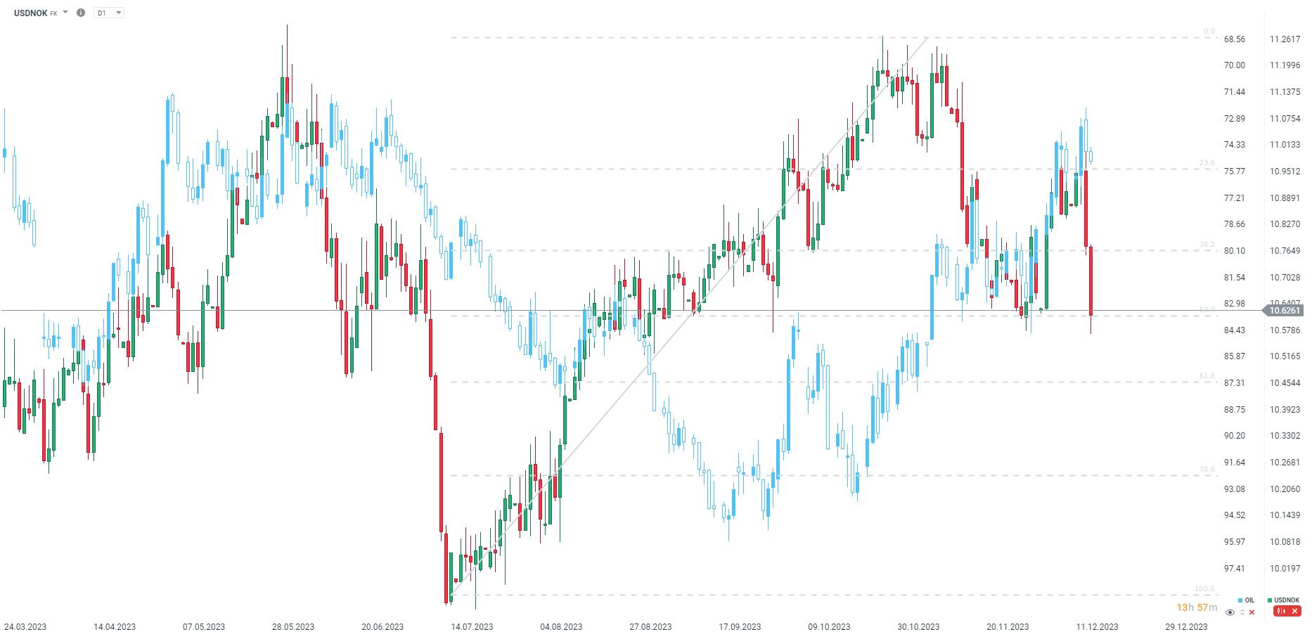 Norges Bank zaskakuje i podnosi stopy procentowe do 4,5! USDNOK kontynuuje wczorajszą mocną przecenę, nawet przy niskiej cenie ropy.