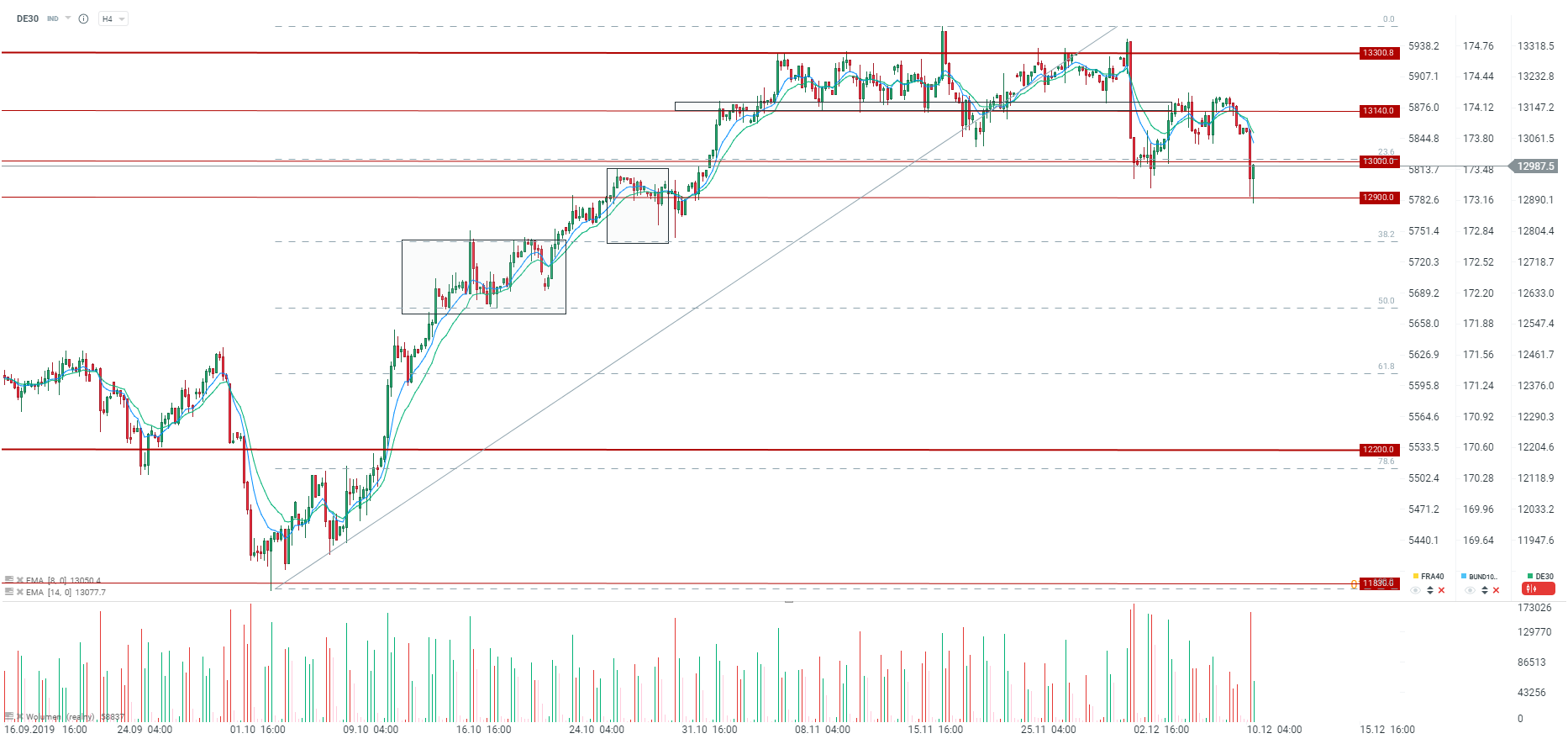 DAX cofa się wyraźnie przez dwa ważne poziomy i następnie redukuje część tych spadków. Obecnie testowany jest "opór" na 13000 punktów. Źródło: xStation5