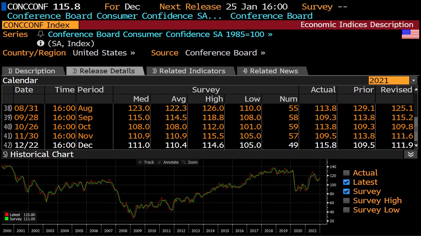 Przed chwilą poznaliśmy odczyt indeksu zaufania konsumentów - Conference Board za grudzień. Oczekiwania przewidywały nieznaczny wzrost do poziomu 110,8 pkt z 109,5 pkt zanotowanych w listopadzie 2021. Odczyt wypadł lepiej od oczekiwań - indeks wyniósł 115,8 pkt