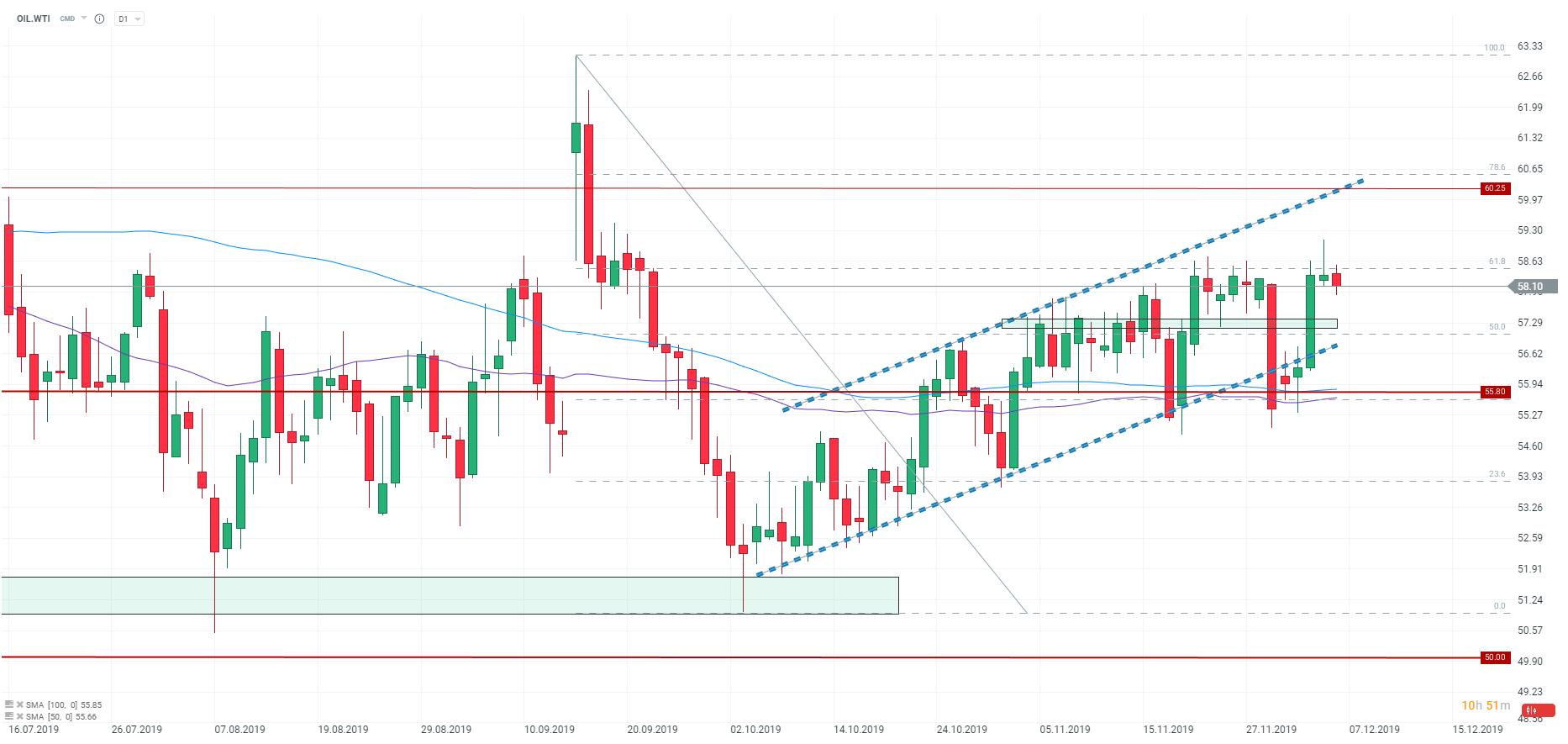 W trakcie zamkniętej sesji na posiedzeniu grupy OPEC+ miało dojść do uzgodnienia dodatkowego cięcia produkcji o 500 tys. brk na dzień od początku przyszłego roku. Obecnie cięcie w całej grupie wynosi 1,2 mln brk, choć realne cięcie wynosi ok. 1,5 mln brk. Wobec tego efekt netto nowego postanowienia będzie prawdopodobnie mniejszy. Ropa nie reaguje z entuzjazmem, wciąż znajdując się poniżej kreski dzisiejszego dnia. Warto przypomnieć, że dzisiaj o godzinie 14:30 opublikowane zostaną dane NFP z USA, które będą miały wpływ na większość rynków.
