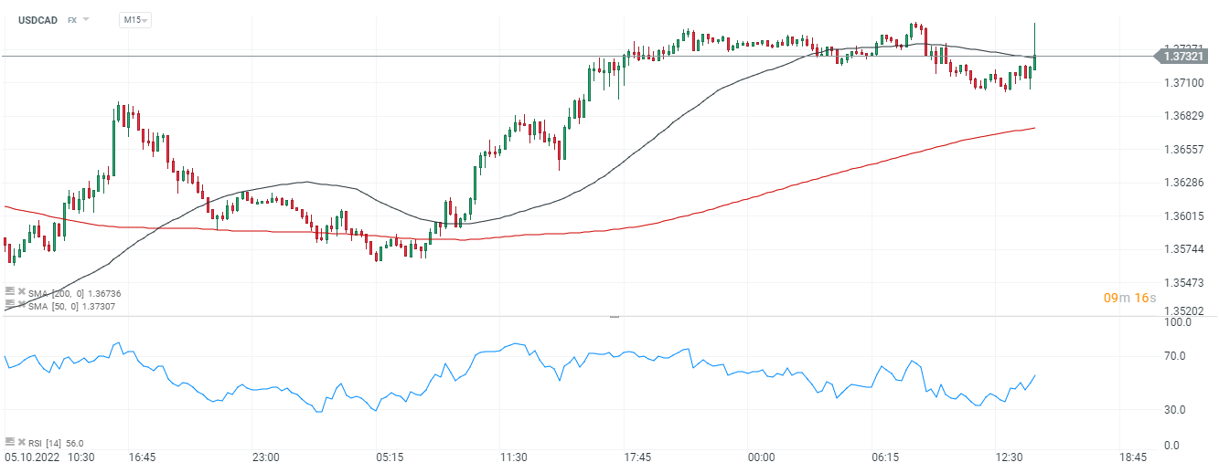Wykres USDCAD, interwał M15. Amerykański dolar umiarkowanie wzmocnił się do dolara kanadyjskiego po NFO jednak wzrostową reakcję ostudził mocny raport z kanadyjskiego rynku pracy we wrześniu. Źródło: xStation5