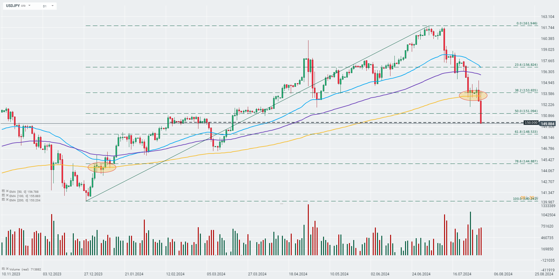 Para USDJPY przebiła przed chwilą barierę 150.00 i tym samym znalazła się na najniższych poziomach obserwowanych od marca tego. W ujęciu intraday spadki sięgają już blisko 1.85%.