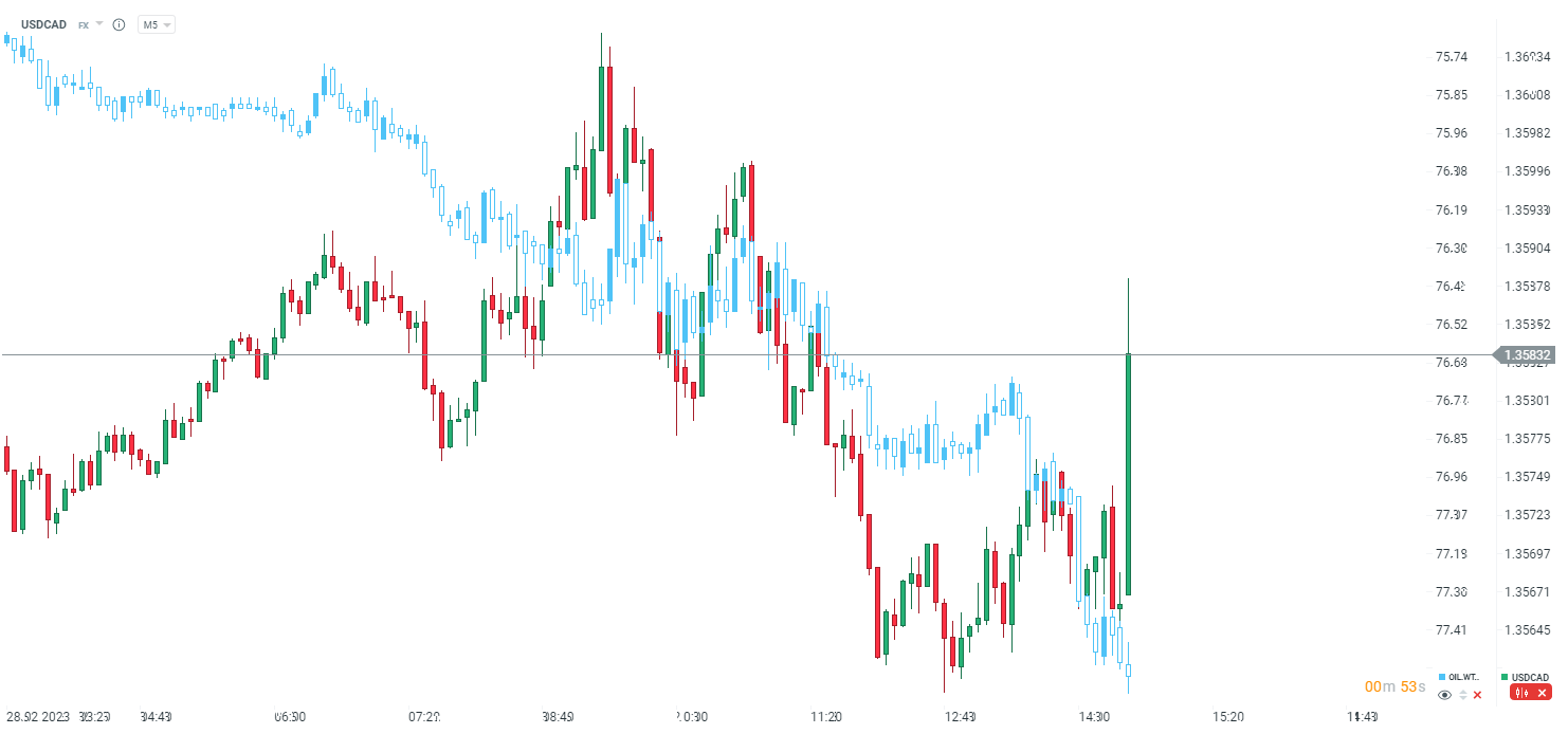USDCAD wyraźnie w górę, pomimo mocniejszej ropy podczas dzisiejszej sesji. Źródło: xStation5