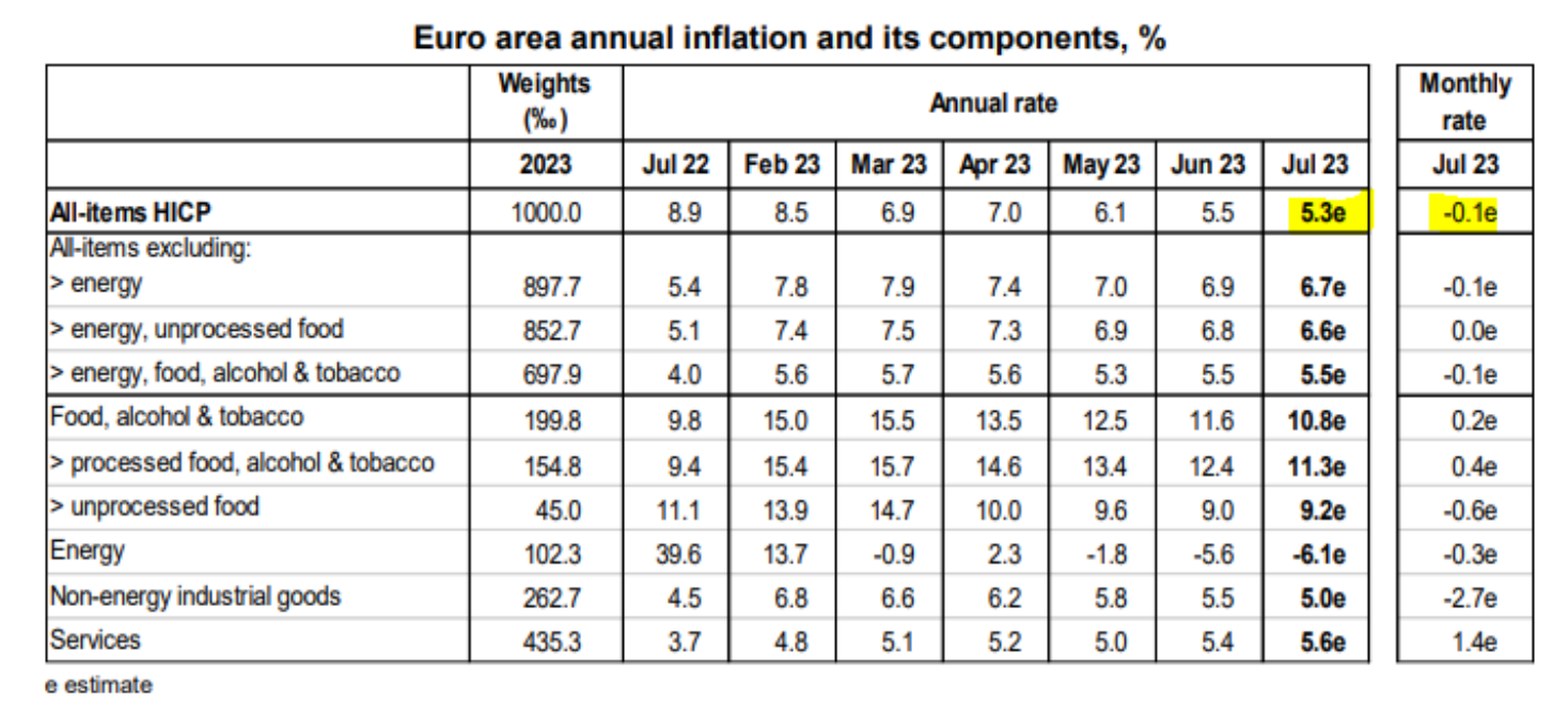Inflacja bazowa wypadła powyżej oczekiwań, co nieco podważa narrację o zakończeniu cyklu podwyżek przez EBC (z drugiej jednak strony lipiec jest co do zasady mocny dla usług, rok temu było to +1,2%, co może przynieść wyraźne spadki tego czynnika w następnych odczytach). W górę zaskakują przede wszystkim ceny usług oraz pożywienia nieprzetworzonego. Źródło: Eurostat