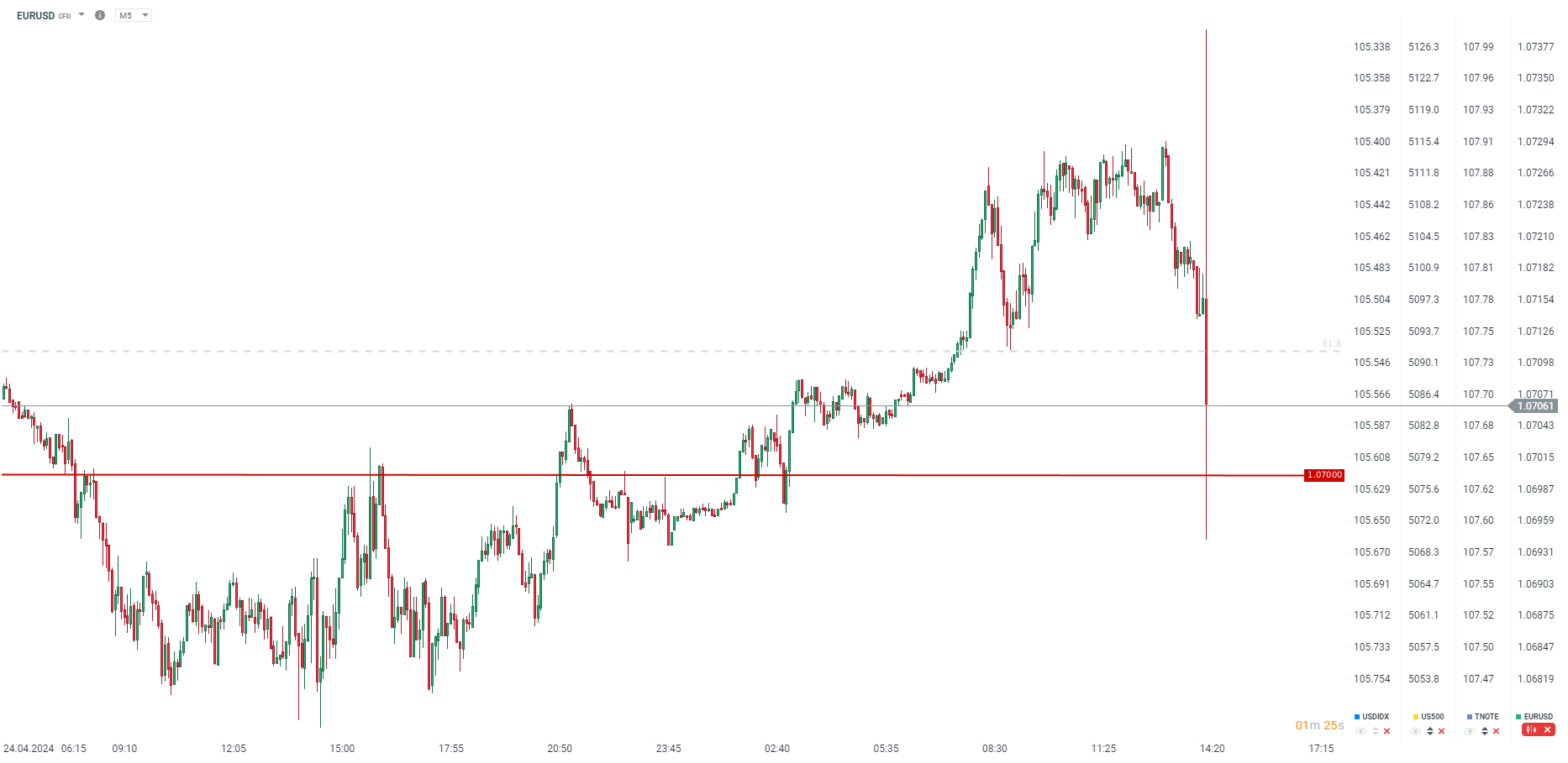 EURUSD na początku rośnie wyraźnie, a później spada i testuje poziom 1,0700.