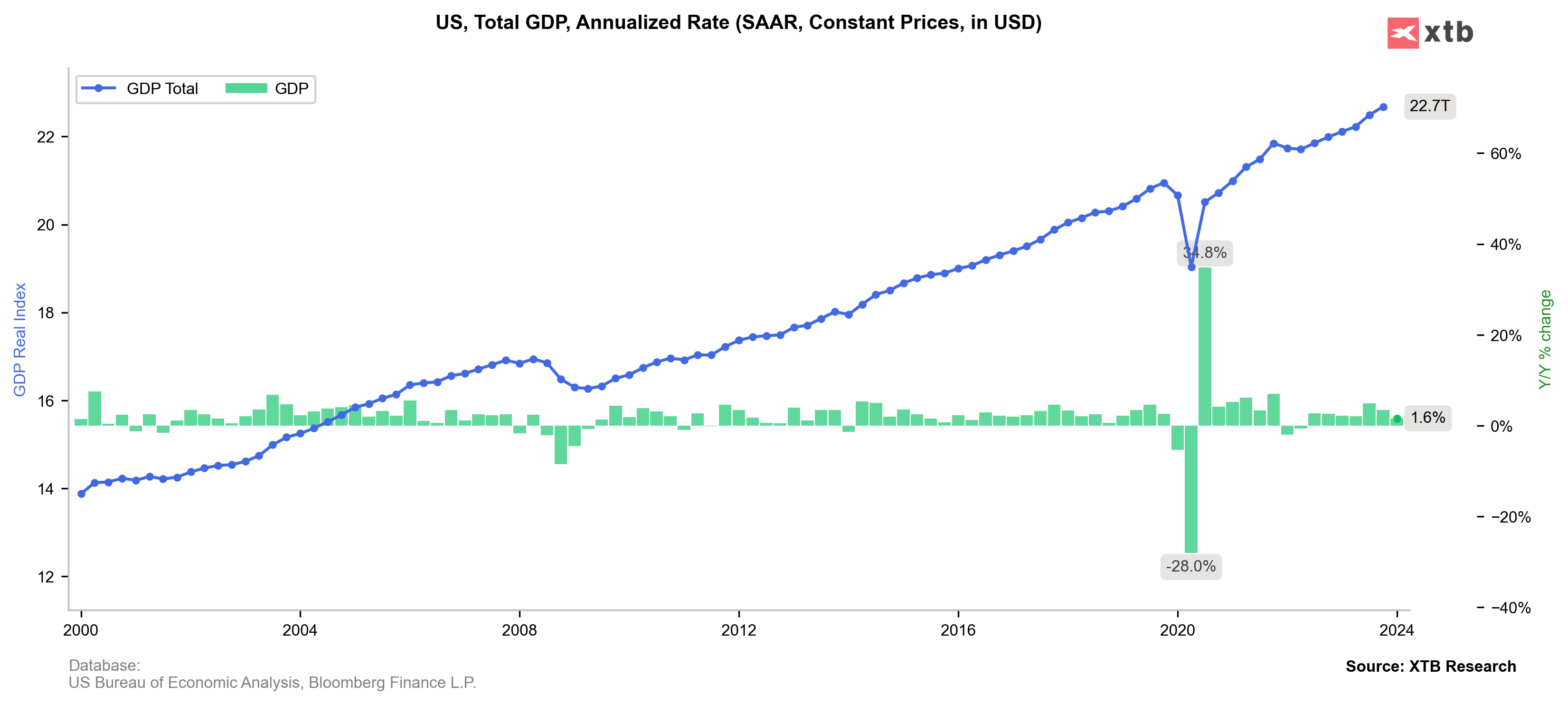 Amerykańska gospodarka rośnie, ale słabiej od oczekiwań, co jest związane m.in. z niższą konsumpcją. Źródło: Bloomberg Finance LP, XTB