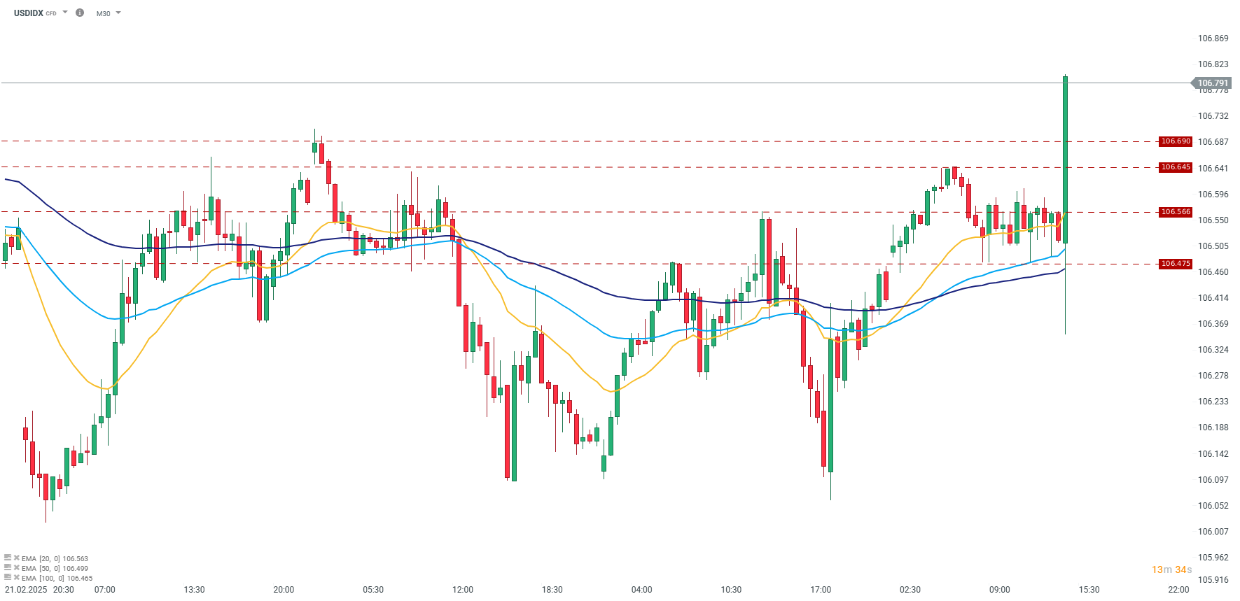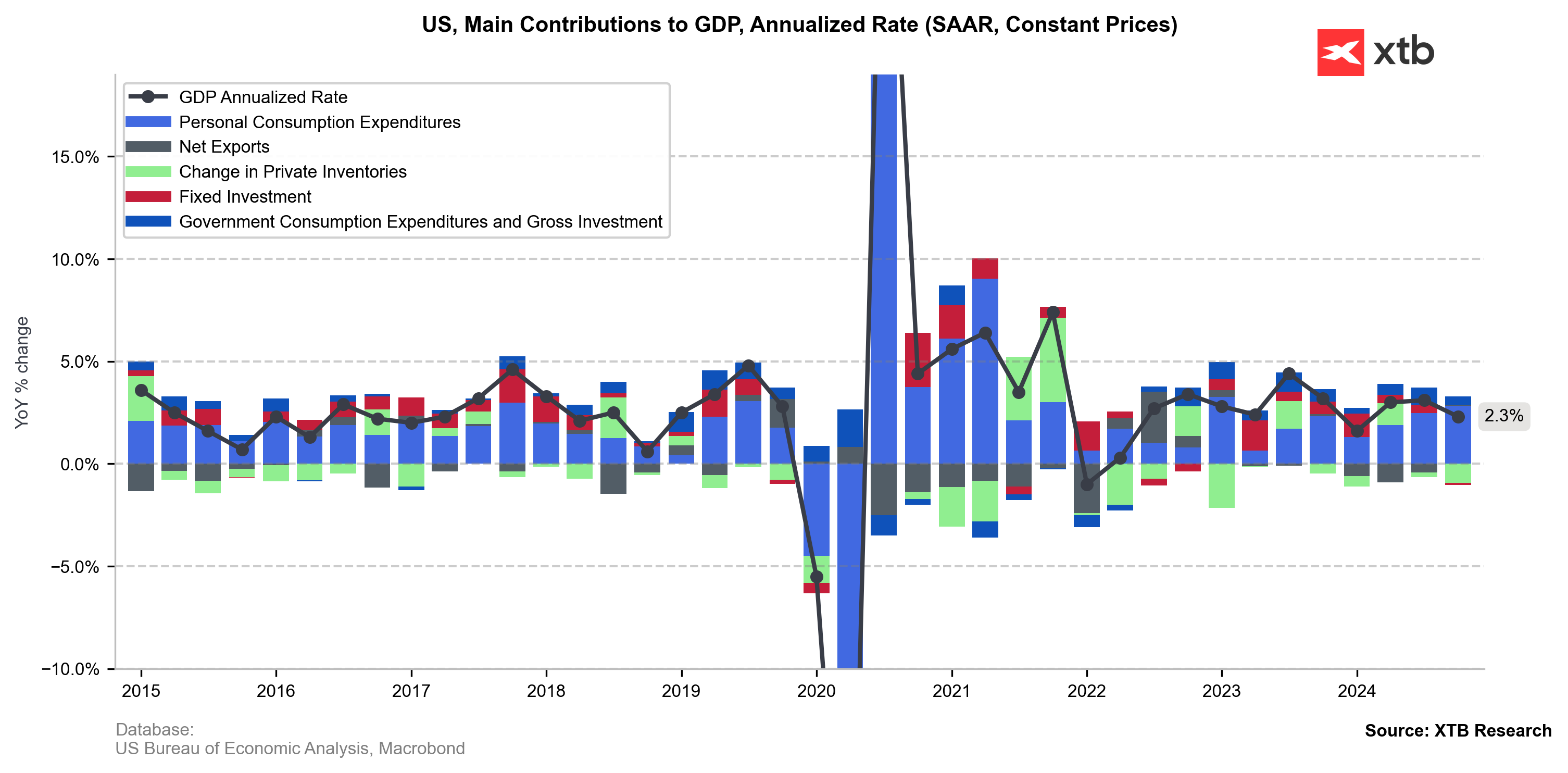 Seria danych z USA przedstawia mieszany obraz. Z jednej strony mamy do czynienia z 2,3% wzrostem PKB, co pozostaje zgodne z oczekiwaniami. Patrząc na poszczególne składowe, możemy zauważyć, że konsumpcja wzrosła o 2,79%, co oznacza słabsze tempo od oczekiwanego, a kwestia konsumpcji stoi jako jeden z najistotniejszych elementów podpierających narrację o trwałości gospodarki Stanów w obliczu ryzyka ceł i ewentualnej wzmocnionej inflacji. Z drugiej strony wyższy wkład wydatków rządowych, a także dodatni efekt bilansu handlowego pozwoliły na utrzymanie wzrostu PKB na prognozowanym poziomie.