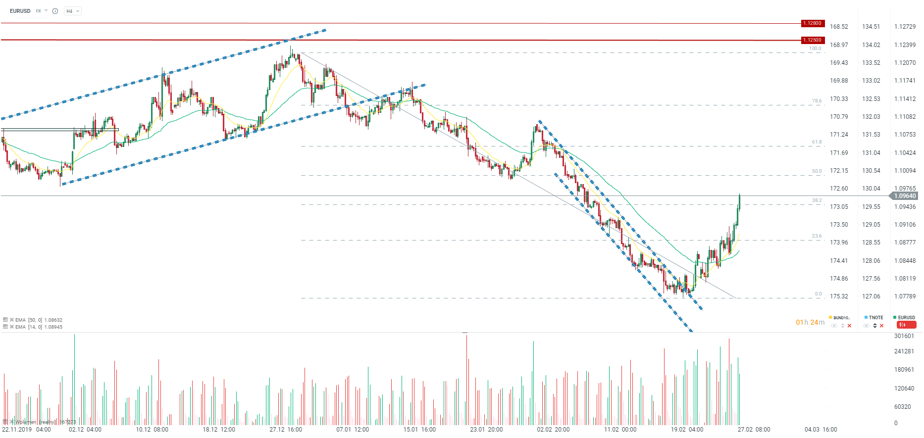 EURUSD jednak kontynuuje odbicie z ostatnich dni. Odbicie z ostatnich godzin to informacje o możliwym zwiększeniu zadłużenia niemieckiego rządu oraz informacje o przeznaczeniu dodatkowych środków na stymulację gospodarki wobec problemu koronawirusa. EURUSD zbliża się powoli do oporu przy poziomie 1,10000.