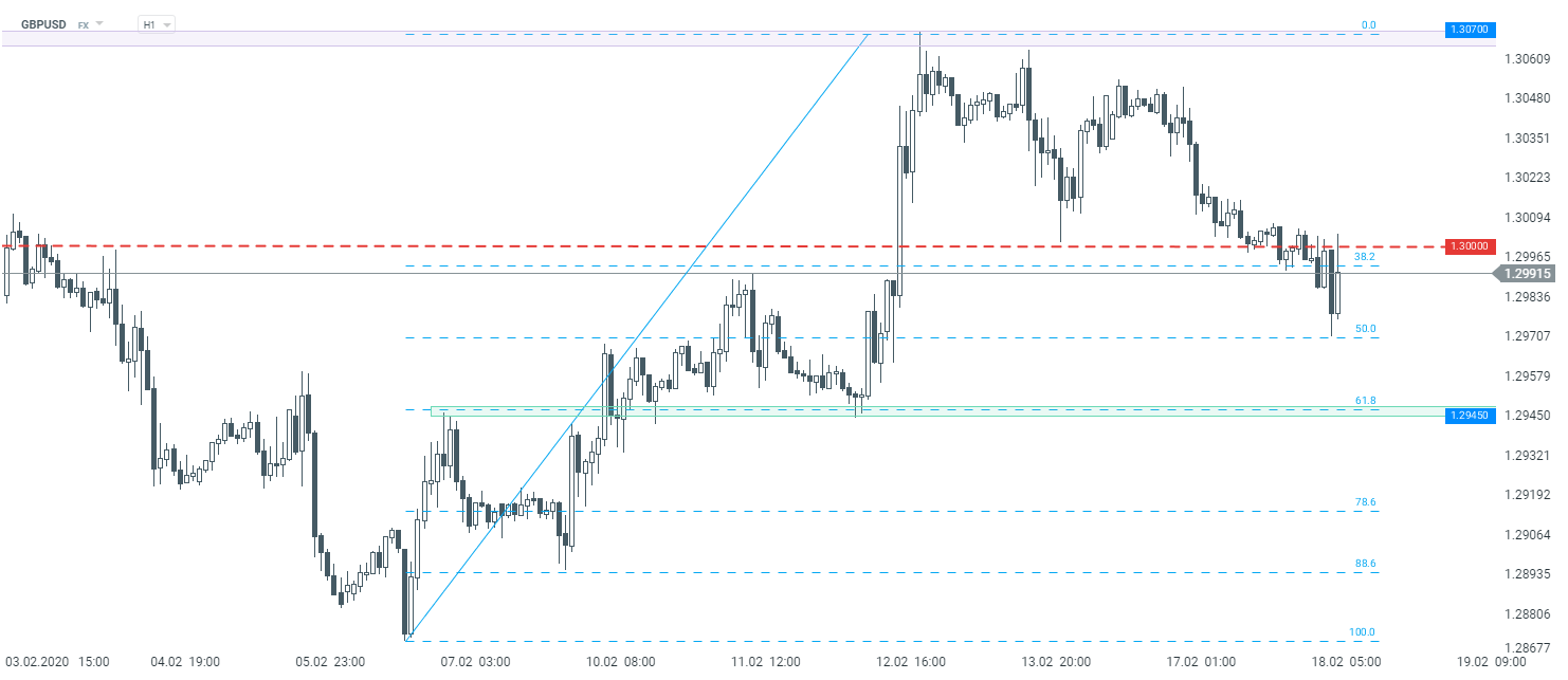 Dzisiejsza sesja na funcie brytyjskim rozpoczęła się od spadków, po tym jak kurs zszedł poniżej 1,30 USD przecena przyspieszyła. Niemniej po godzinie 10:00 rynek zaczął dynamicznie odbijać przez co tuż przed danymi doszło do testu od dołu bariery przy okrągłym poziomie. W pierwszej reakcji po danych możemy jednak obserować kolejną obronę wspomianego poziomu 1,30.