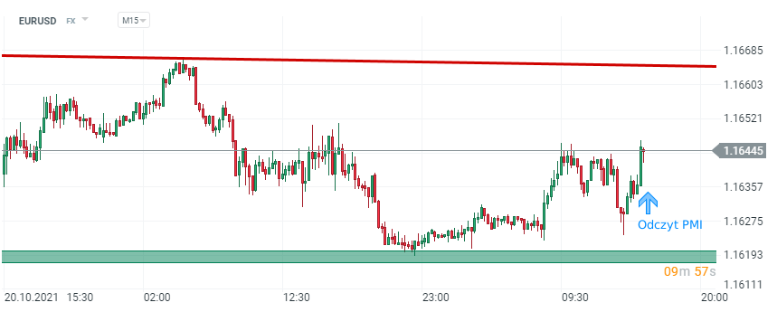 Wykres EURUSD, interwał M15. Brak większej zmiany na dane PMI. Źródło: xStation 5