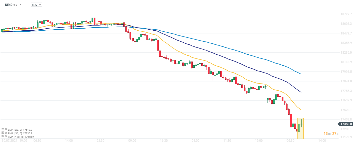 Dane z Europy nie okazały się zaskoczeniem. W mocno naznaczonym negatywnie sentymencie rynkowym, jaki widzimy dziś od początku sesji w wyniku drastycznych przecen na japońskiej giełdzie, brak negatywnego zaskoczenia wspiera notowania indeksów europejskich, które po publikacji lekko umacniają się, częściowo niwelując straty. Dalej jednak przeceny na europejskich indeksach przekraczają 2%.