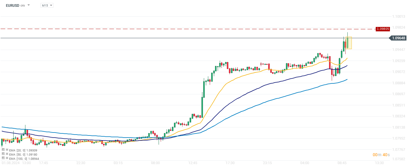 Po odczytach PMI euro kontynuuje umacnianie się w stosunku do dolara, które widzimy dziś od początku sesji. EURUSD zbliża się do maksimum z lutego tego roku.