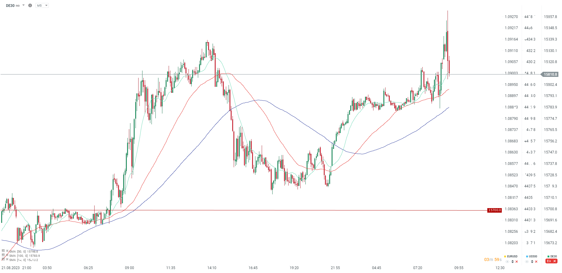 Co ciekawe w pierwszej reakcji na DE30 obserwujemy wzrosty. Skąd takie ruchy? Może to być związane z tym, że słabe dane mogą doprowadzić do zmiany nastawienia EBC, który mógłby już nie podnieść stóp procentowych. Z drugiej strony po dotarciu do 15850, DE30 cofa się dosyć szybko. Kluczowa strefa wsparcia znajduje się od 15785 do 15800 punktów.