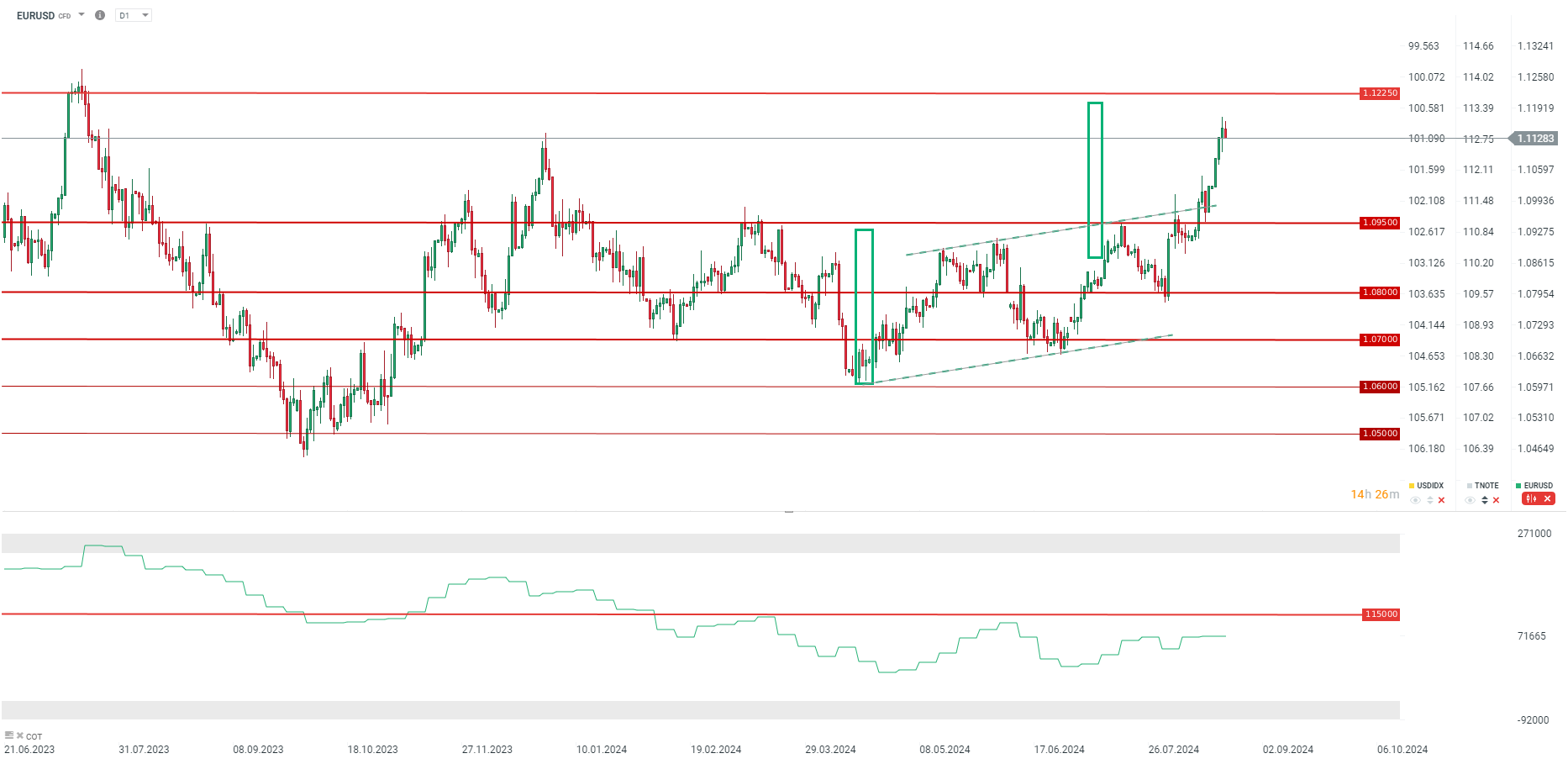 Warto zwrócić uwagę na anomalię we Francji w sektorze usług, ale jest to powiązane z odbywającymi się jeszcze niedawno Igrzyskami Olimpijskimi. Słabość gospodarcza w strefie euro utrzymuje się, co powinno prowadzić do kolejnej obniżki ze strony EBC. Dzisiaj minutes z tego banku, dlatego będziemy patrzyli na ewentualne sygnały dotyczące wrześniowego posiedzenia. EURUSD cofa się po tym, jak wczoraj doszło do naruszenia szczytów z grudnia 2023 roku: