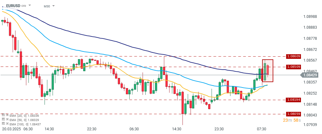 Dane z Francji spowodowały lekkie umocnienie się euro w stosunku do dolara, jednak większość ruchów została wymazana po publikacji danych z Niemiec. Źródło: xStation