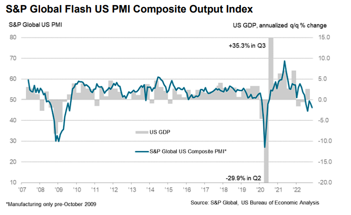 Dzisiejszy odczyt danych PMI wykazał powrót nastrojów w przemyśle poniżej 50!. Źródło: SP Global![]()