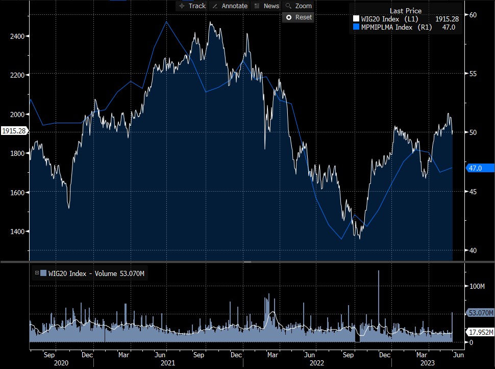 PMI z Polski wypada na poziomie 47 punktów przy oczekiwaniu 46 oraz przy poprzednim poziomie 46,6. Dzisiaj poznaliśmy dane za maj. Jeśli WIG20 miałby być wskaźnikiem wyprzedzającym dla PMI, który z kolei jest wskaźnikiem dla PKB, to w niedalekiej przyszłości sytuacja powinna być lepsza, choć jednocześnie twarde dane dotyczące sprzedaży detalicznej czy produkcji przemysłowej w ostatnich odczytach nie zachwycały. Złoty pozostaje dzisiaj dosyć słaby, w szczególności do dolara oraz franka.