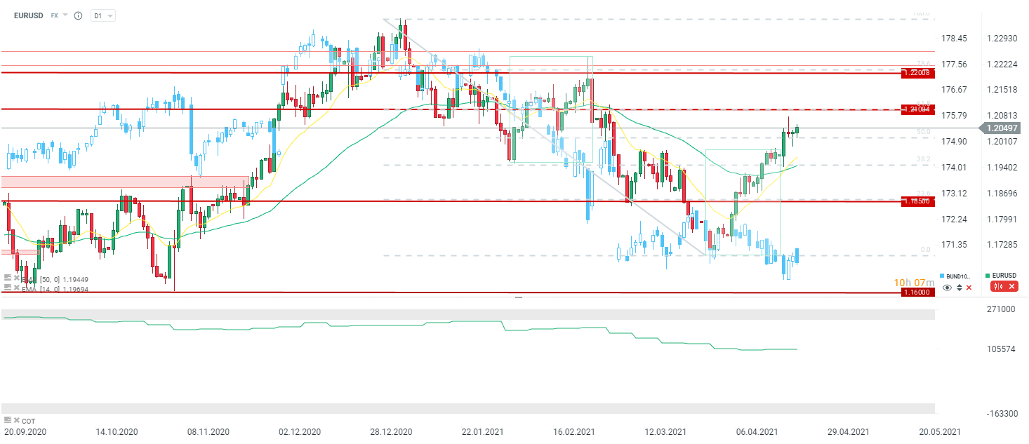Zgodnie z oczekiwaniami EBC pozostawia politykę bez zmian. Główna stopa procentowa na 0,00%, depozytowa na -0,5%. Program QE będzie kontynuowany na poziomie 20 mld miesięcznie, a z kolei cały program PEPP na poziomie 1,85 bilionów EUR. EBC podkreśla tak jak poprzednio, że w obecnym kwartale tempo skupów będzie większe. EURUSD minimalnie zyskuje po publikacji decyzji. Ciekawiej może być oczywiście po 14:30, kiedy to mogą paść pytania na temat realizacji szybszego tempa zakupów aktywów w ramach programu PEPP w tym kwartale.