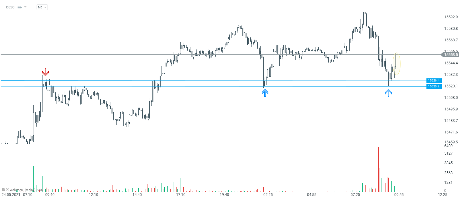 Patrząc na wykres, tuż po danych obserwujemy pozytywną reakcję. DE30 odbił się od strefy wsparcia o której mieliśmy w pobranym webinarium i próbuje kontynuować wzrosty. Dopiero w momencie zanegowania wspomnianej strefy mogłoby dojść do pogłębienia spadków.