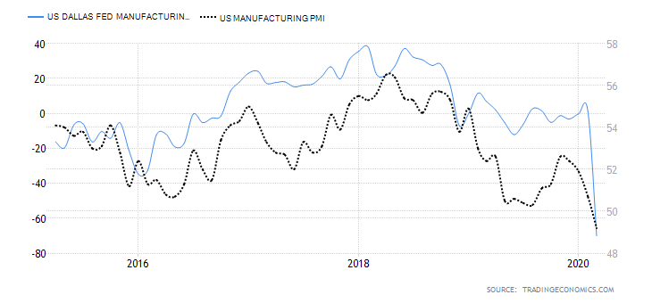 PMI spadał już od dłuższego czasu, natomiast indeks Fed z Dallas zaliczył teraz ogromny spadek. Co ciekawe, w przeciągu ostatnich 10 lat to raczej indeks PMI był bardziej zmienny w porównaniu do indeksu regionalnego z Dallas. Źródło: Trading Economics