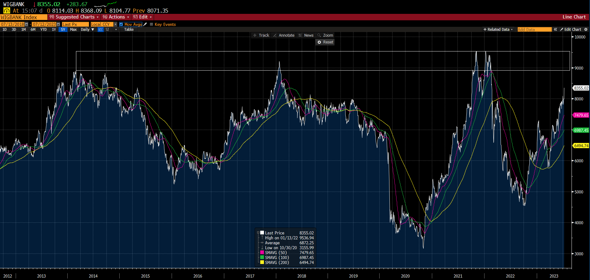 Subindeks WIG-BANKI wznosi się na najwyższe poziomy od lutego 2022 roku. Źródło: xStation 5