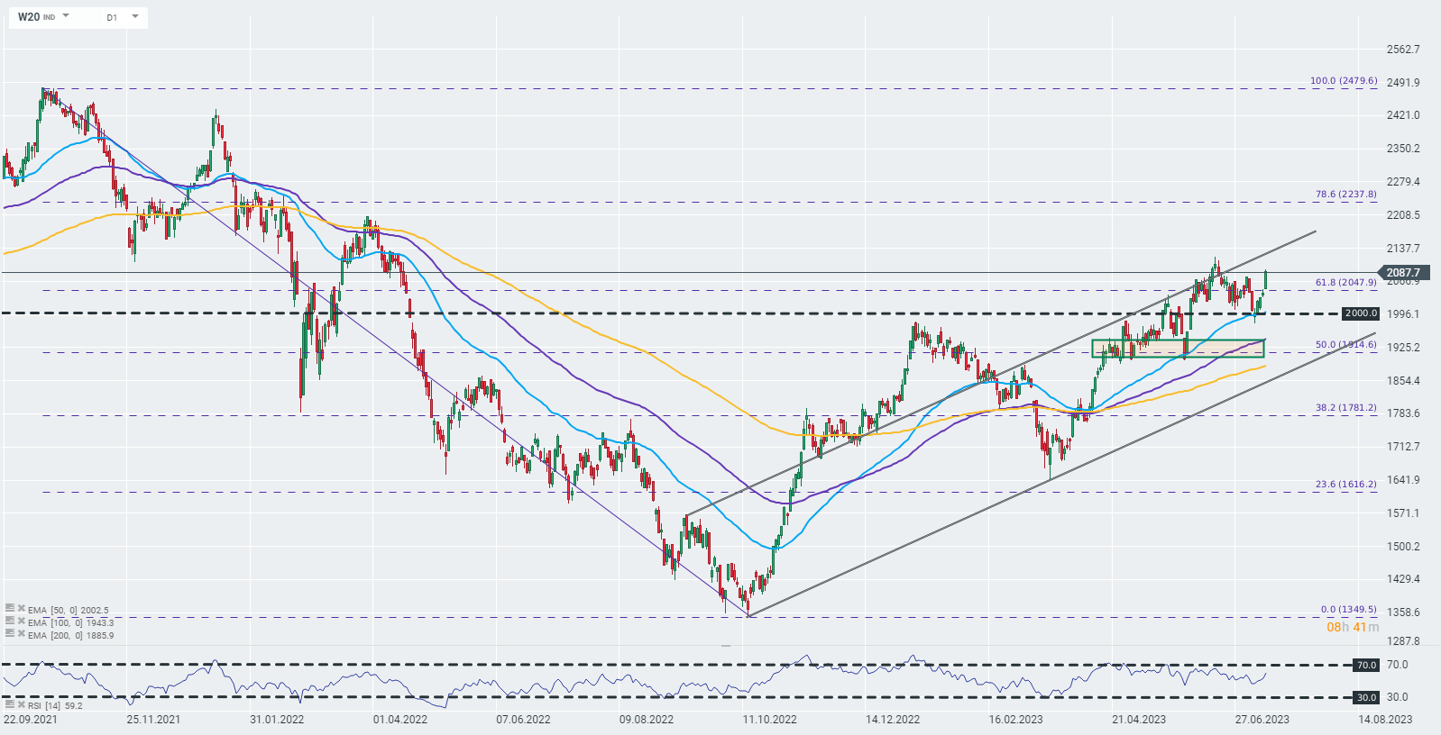 Dzisiejsza euforia wznosi notowania W20 w okolice 2090 punktów, poziomu, który graniczy ze strefą ostatnich, lokalnych szczytów oraz psychologicznej bariery 2100 punktów. Źródło: xStation 5