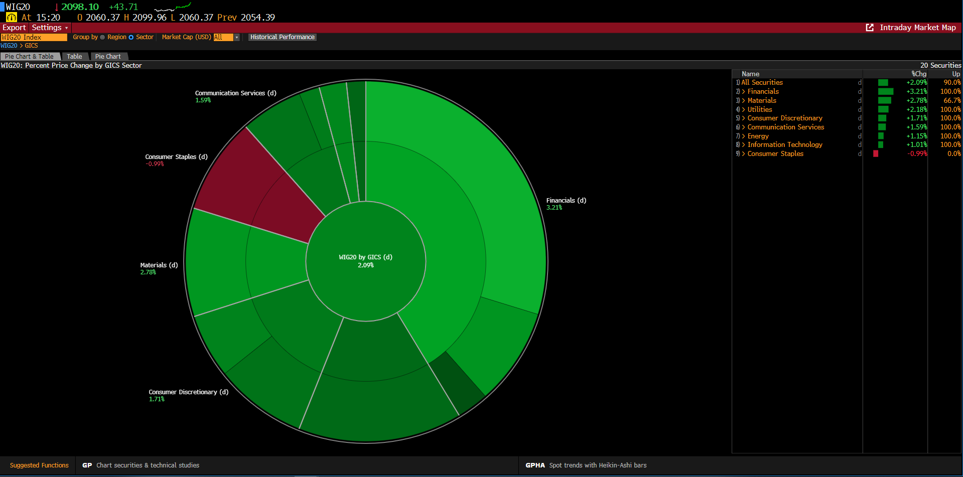Bycze nastroje rynkowe ze zdwojoną siłą działają dzisiaj na polską giełdę, gdzie kontrakty W20 zyskują blisko 2,5% i wzbijają się w okolice 2090 punktów, poziomów bliskich psychologicznej bariery 2100 punktów.