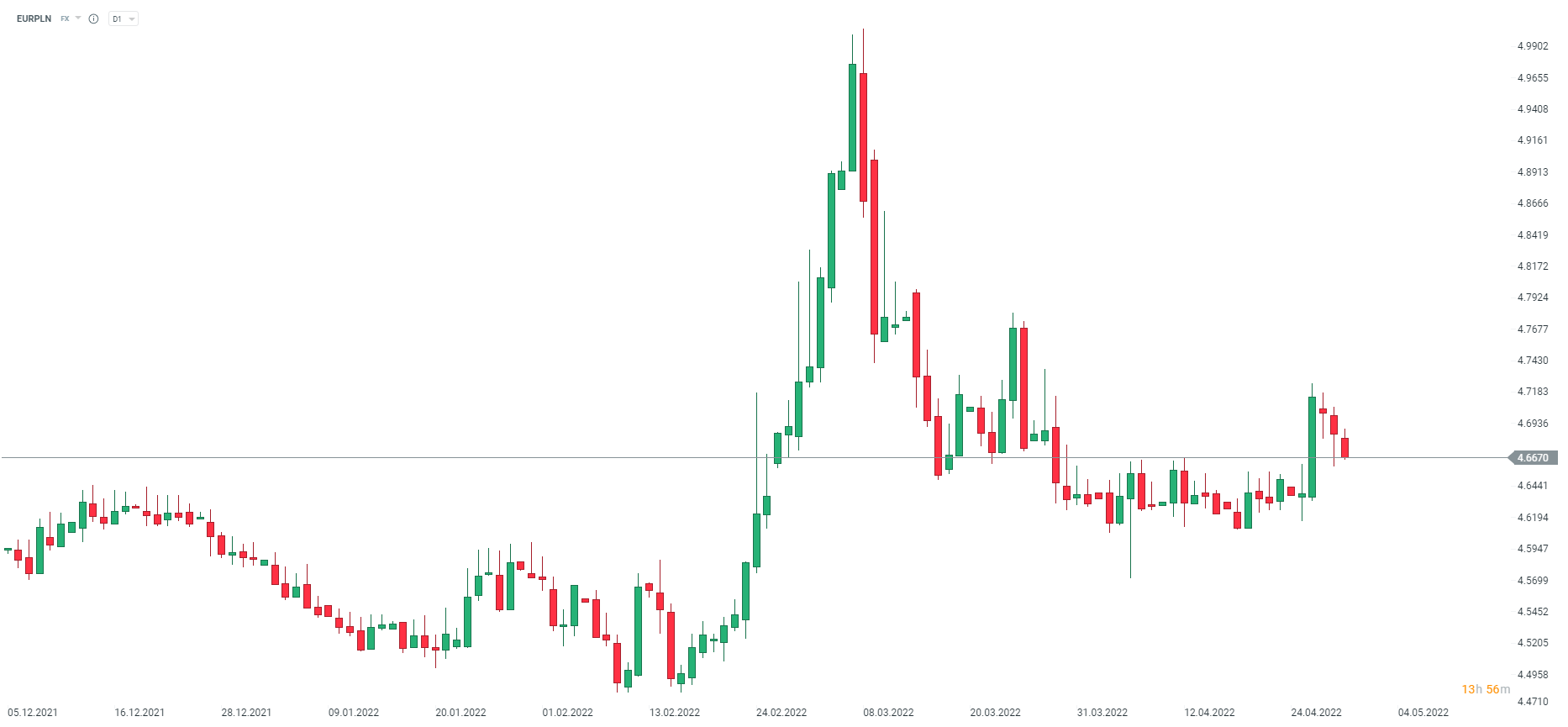 Złoty umacnia się dzisiaj, ale z pewnością taki odczyt inflacyjny nie powinien służyć złotemu. Jest to jednak zapowiedź tego, że stopy procentowe prawdopodobnie nie zatrzymają się na poziomie 7-8%. Źródło: xStation5