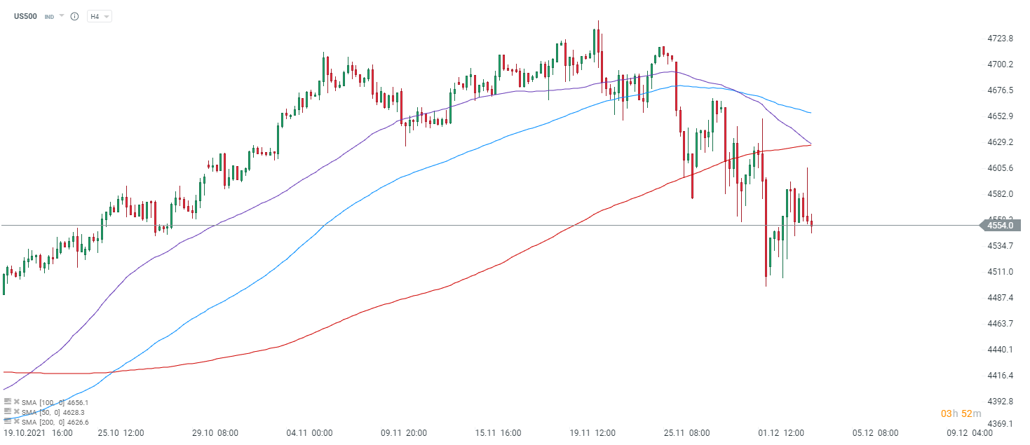 S&P 500 cofa się, podobnie jak na wcześniejszej H4. Po NFP kontrakty na indeksy z Wall Street próbowały odbijać. Z drugiej strony słabsze dane NFP nie zmieniają perspektyw w Fed, a teraz dane ISM umacniają w przekonaniu potrzeby zdjęcia stymulacji. Źródło: xStation5