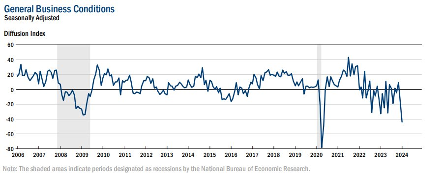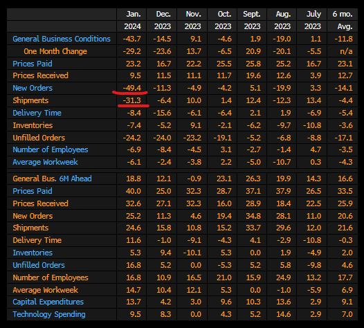 Aktywność biznesowa gwałtownie spadła w stanie Nowy Jork, według firm odpowiadających na ankietę Empire State Manufacturing Survey ze stycznia 2024 roku. Główny indeks ogólnych warunków biznesowych spadł o dwadzieścia dziewięć punktów do -43,7, najniższego odczytu od maja 2020 roku