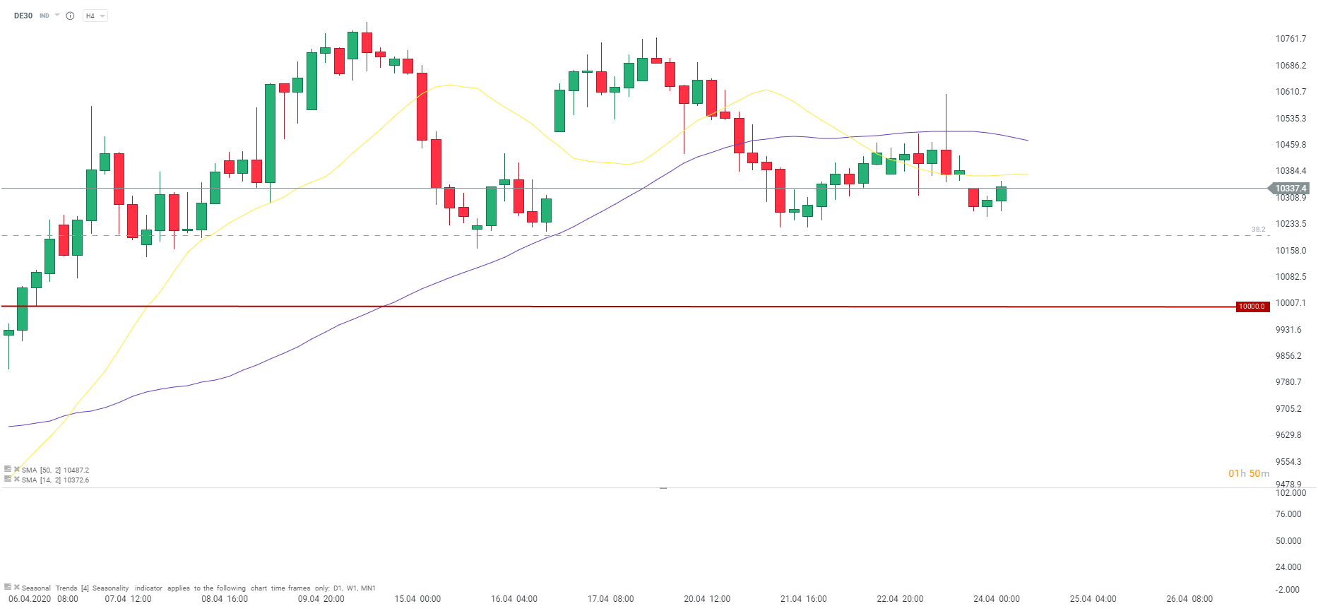 DAX jest notowany dzisiaj bardzo nisko, ale podnosi się po luce spadkowej z otwarcia kontraktów. Obecnie przeprowadzana jest próba domknięcia luki, choć może przeszkadzać średnia 14 okresowa. Rynek kasowy notuje obecnie 1,6% spadku. Źródło: xStation5