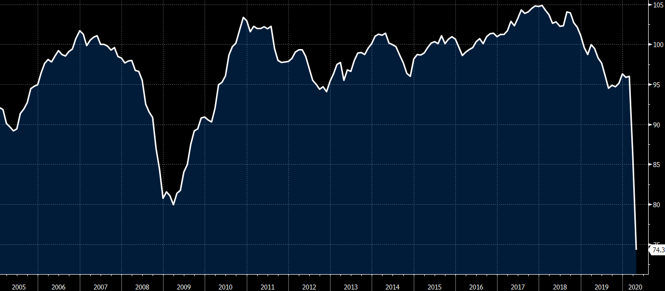 Indeks IFO spada do poziomu 74,3 punktów z poziomu 86,1 punktów przy oczekiwaniu na poziomie 79,7 punktów. Indeks oczekiwań wypadł na poziomie 69,4 puntków przy oczekiwaniu 75 punktów. Z kolei ocena bieżącej sytuacji wypadła na poziomie 79,5 punktów przy oczekiwaniu 80,5 punktów oraz przy poprzednim poziomie 93 punktów. Jak widac na poniższym wykresie obserwujemy drastyczny spadek, poniżej poziomów z poprzedniego kryzysu finansowego. Dane te odzwierciedlają fatalne nastroje, które było również widać po wczorajszych publikacjach indeksu PMI. Oczywiście nie jest to zaskoczeniem, że jest to najniższy odczyt w historii. Jak widać, oczekiwania w stosunku do przyszłości są zdecydowanie gorsze niż ocena bieżącej sytuacji.