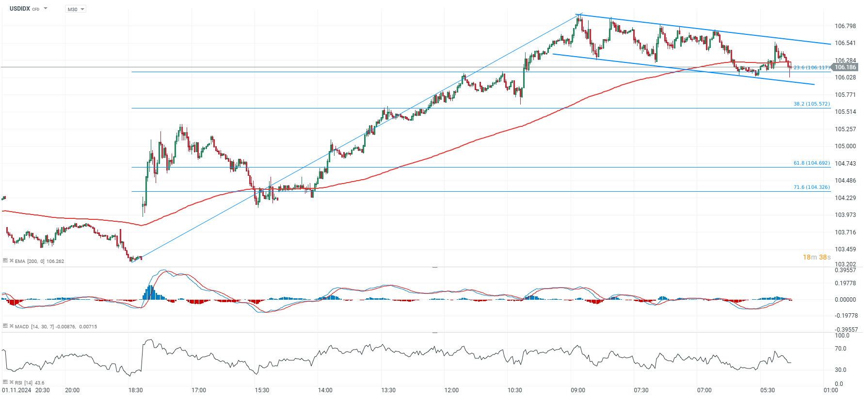 USDIDX dziś nieznacznie zyskuje, ale od 14 listopada indeks dolara notuje konsekwentne, ale bardzo ograniczone spadki. Wybicie powyżej 106.5 mogłoby sugerować wybicie górą z formacji flagi i następny impuls wzrostowy.