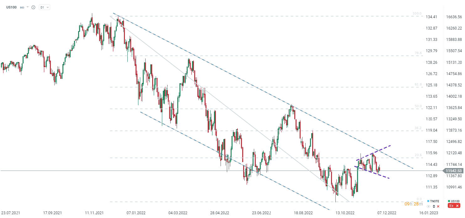 Nie jest to informacja, którą chciałby zobaczyć Fed. Inflacja PPI spada, ale znacznie wolniej od oczekiwań. To pokazuje, że jest raczej mało szansy na spadek CPI poniżej 7%. Jednocześnie Powell może utrzymać bardziej jastrzębie stanowisko, chyba że CPI wypadnie znacznie niżej. Źródło: xStation5