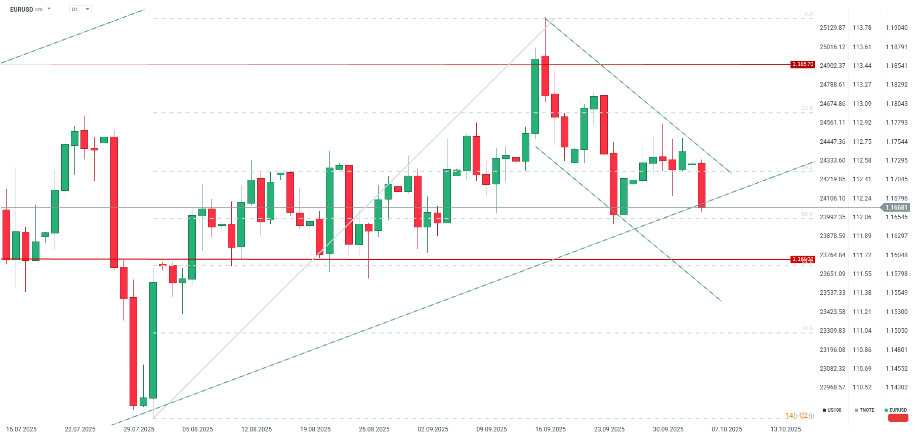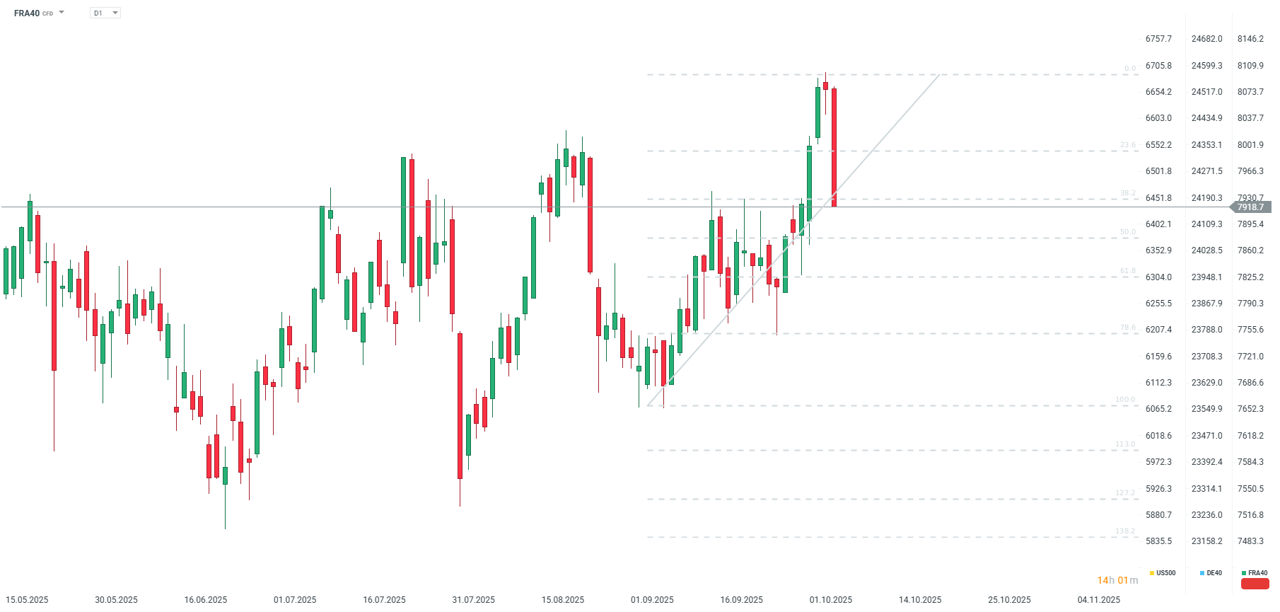 W ostatnich minutach pojawiła się informacja, iż premier Lecornu rezygnuje ze swojego stanowiska. To kolejna rezygnacja w ostatnich tygodniach. Prezydent Macron dał czas Sebastianowi Lecornu na utworzenie rządu do niedzieli wieczorem. Oczekiwano, że dzisiaj poznamy nowych ministrów. W odpowiedzi na rezygnację obserwujemy spadek euro, spadek FRA 40 i wyraźny wzrost rentowności. Spread pomiędzy 10 letnimi niemieckimi oraz francuskimi rentownościami rośnie do najwyższych poziomów od stycznia zeszłego roku.