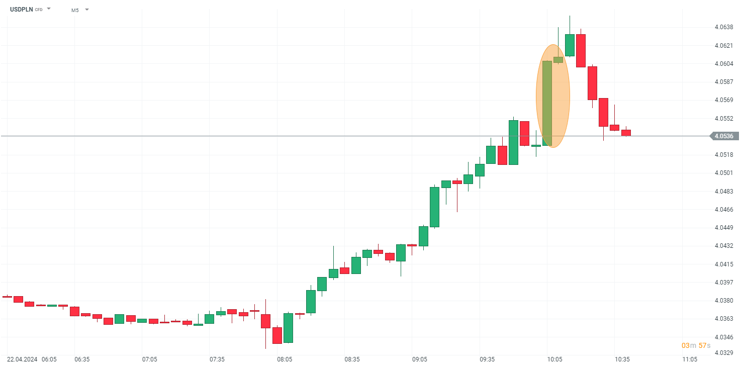 Reakcję na dane widać było także na kursie dolara do złotego, który po krótkotrwałym skoku powrócił jednak do rejonów 4,05 zł notowanych przed publikacją danych.