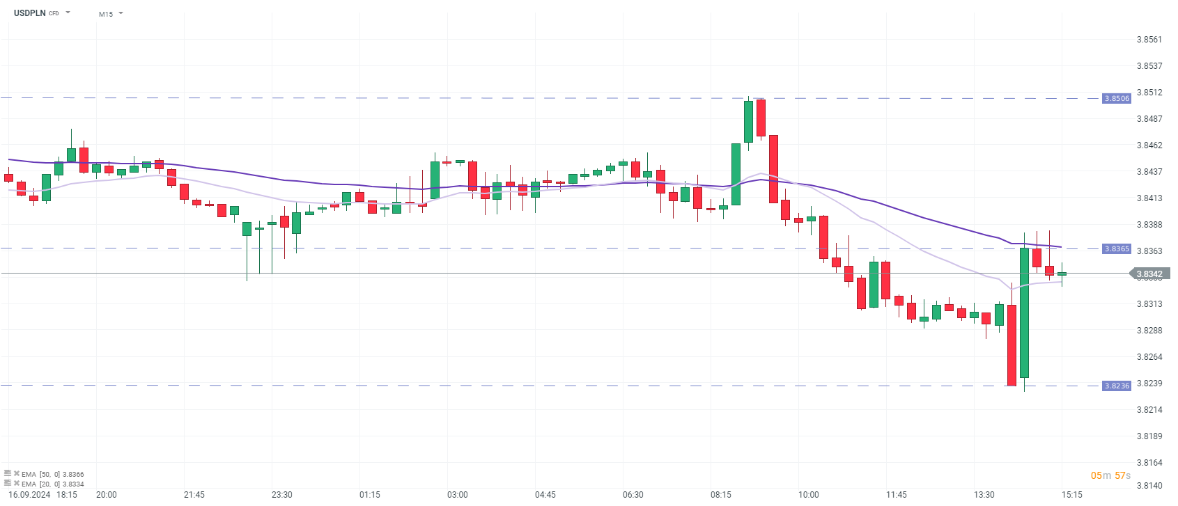 Produkcja przemysłowa za sierpień wzrosła istotnie powyżej oczekiwań rynku, będąc wraz z "nierecesyjnymi" danymi za sprzedaż obiecującym sygnałem dla największej gospodarki świata. Lepsze odczyty zdecydowanie zmniejszają presję na agresywne luzowanie polityki monetarnej (50 pb), zwiększając prawdopodobieństwo obniżki o 25 pb podczas jutrzejszego FOMC. Kurs USDPLN, wybity w górę po danych sprzedażowych, nie notuje dużej zmienności w związku z danymi produkcyjnymi.