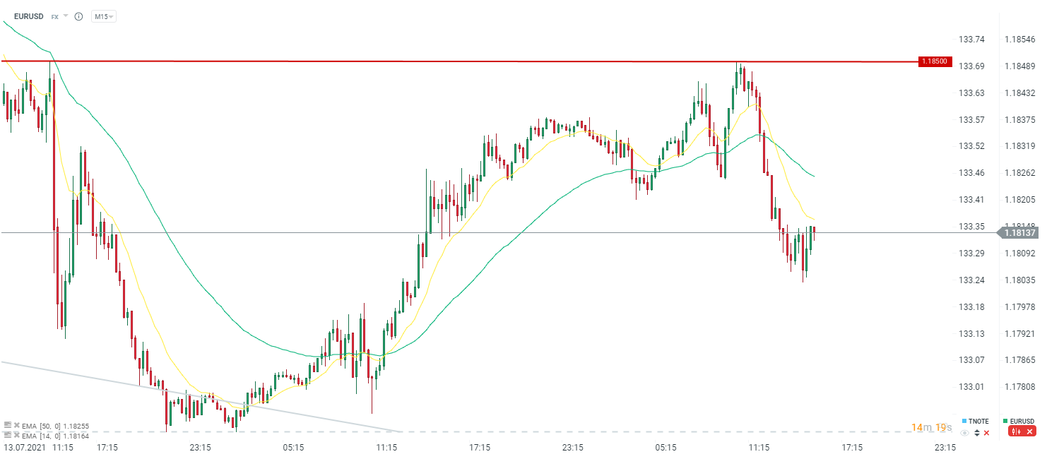 Po danych obserwujemy próbę odbicia na EURUSD. Niemniej dopóki nie dojdzie do przebicia średniej krótkoterminowej, cały czas mowimy o korekcie wzrostowej w trendzie spadkowym (biorąc pod uwagę jedynie dzisiejszy dzień). Źródło: xStation5