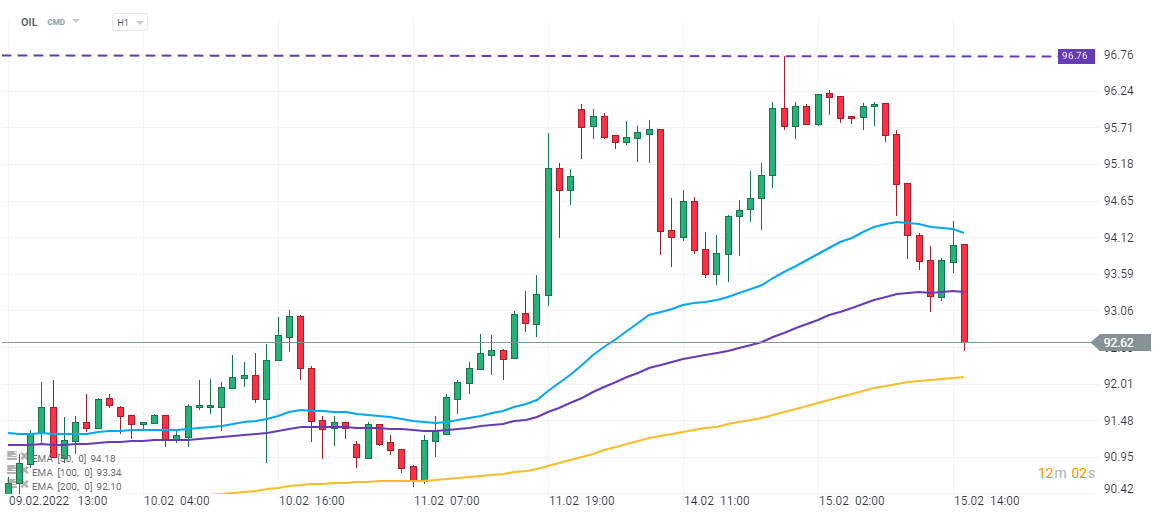Spadki cen ropy (OIL) przyspieszyły po spotkaniu Scholza i Putina. Interwał H1. Źródło: xStation 5