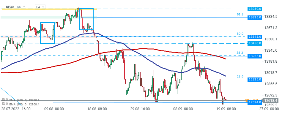DE30 zareagował nieznaczynm spadkiem na przemówienie Putina, jednka wciąż znajduje się powyżej lokalnego wsparcia na poziomie 12594 pkt. Źródło: xStation5