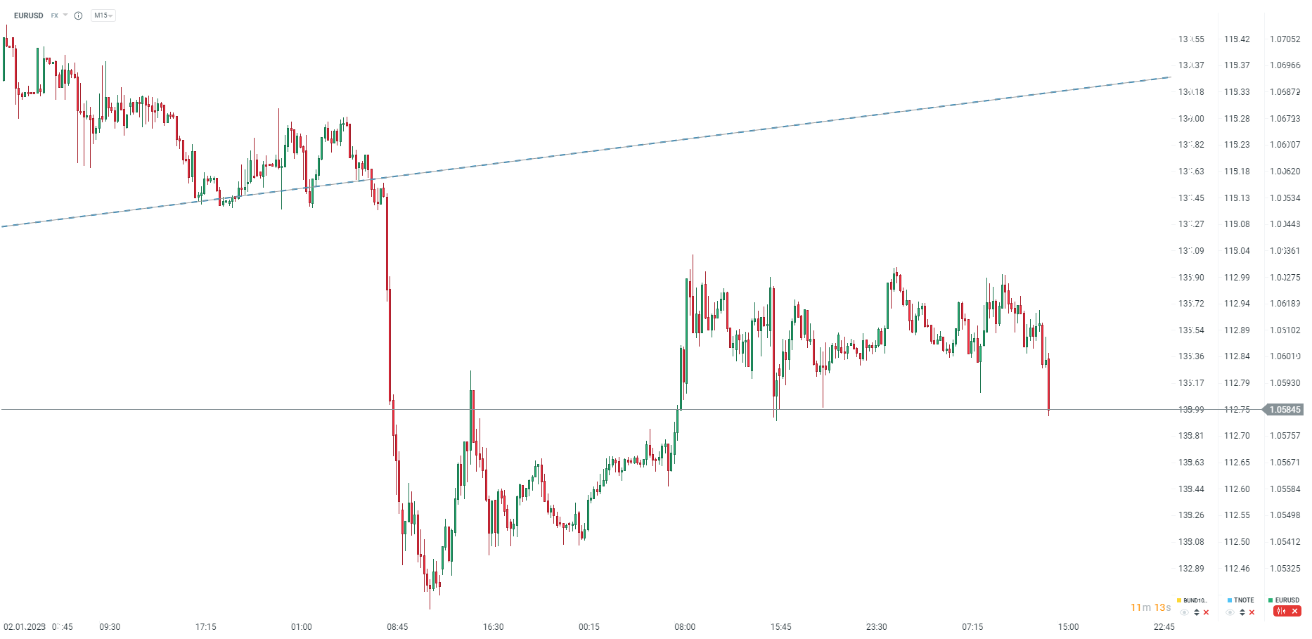Dolar wyraźnie umacnia się po raporcie. To potwierdzenie domysłów Fed, że rynek pracy jest zbyt mocny, aby inflacja mogła spadać zgodnie z oczekiwaniami. Jutro raport NFP. Źródło: xStation5