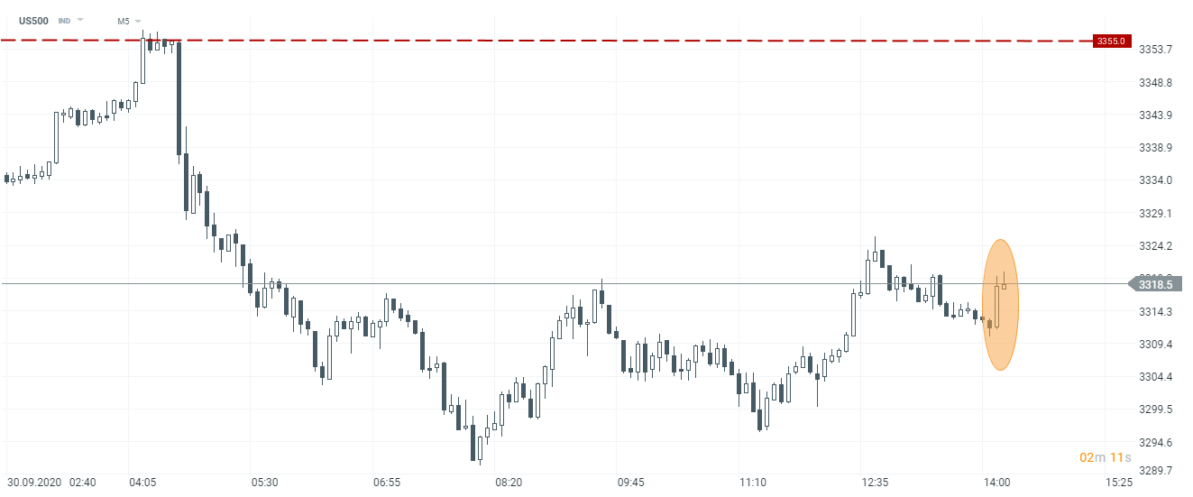 US500 zaczął umacniać się tuż przed publikacją ADP. Począwszy od godzin porannych można dostrzec sekwencję coraz wyższych szczytów i dołków, choć indeks wciąż znajduje się znacznie poniżej poziomów sprzed debaty prezydenckiej w USA. Źródło: xStation5