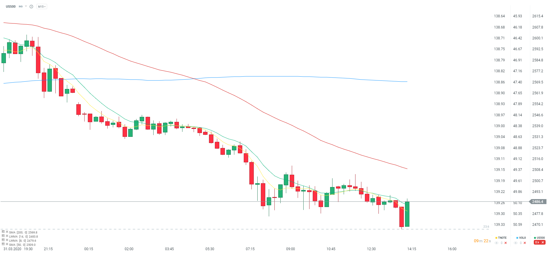 S&P 500 reaguje pozytywnie na dane. S&P 500 odbija z dziennego dołka i kieruje się ponownie w kierunku 2500 punktów. Za nieco ponad godzinę start sesji na Wall Street. Źródło: xStation5
