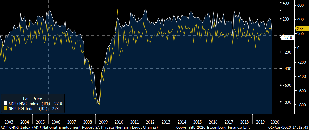 Raport ADP pokazuje spadek zatrudnienia na poziomie 27 tys. za marzec (zatrudnienie prywatne), przy oczekiwaniu spadku na poziomie 150 tys. Poprzednio w lutym wzrost zatrudnienia wyniósł wg ADP 179 tys. (rewizja w dół z poziomu 183 tys.). Jest to bardzo pozytywny raport, choć jednocześnie wydaje się mało odzwierciedlać rzeczywistość (jest to szacunek modelowany i jednocześnie dane bazują na 12 dniu danego miesiąca, czyli sprzed pierwszej falii epidemii w USA). Przypomnijmy, że ostatnie dane dotyczące wniosków o zasiłek dla bezrobotnych pokazały liczbę prawie 3,3 mln osób. Oczywiście część osób weszła ponownie na rynek pracy w związku z chęcią posiadania ubezpieczenia zdrowotnego, ale claimsy mogą obrazować obecnie w lepszy sposób faktyczny stan rynku zatrudnienia. Niemniej warto zauważyć, że podczas ostatniego kryzysu zdarzały się miesiące, gdzie zatrudnienie spadało o ponad 800 tys.