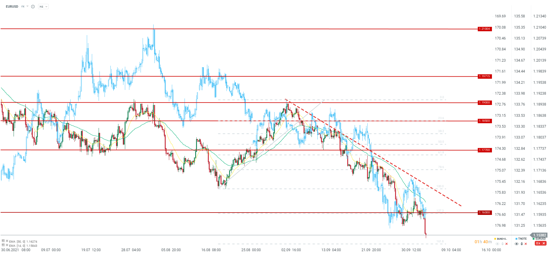 EURUSD w zasadzie nie reaguje na odczyt. Na kontrakcie US500 kontynuacja spadków. Źródło: xStation5