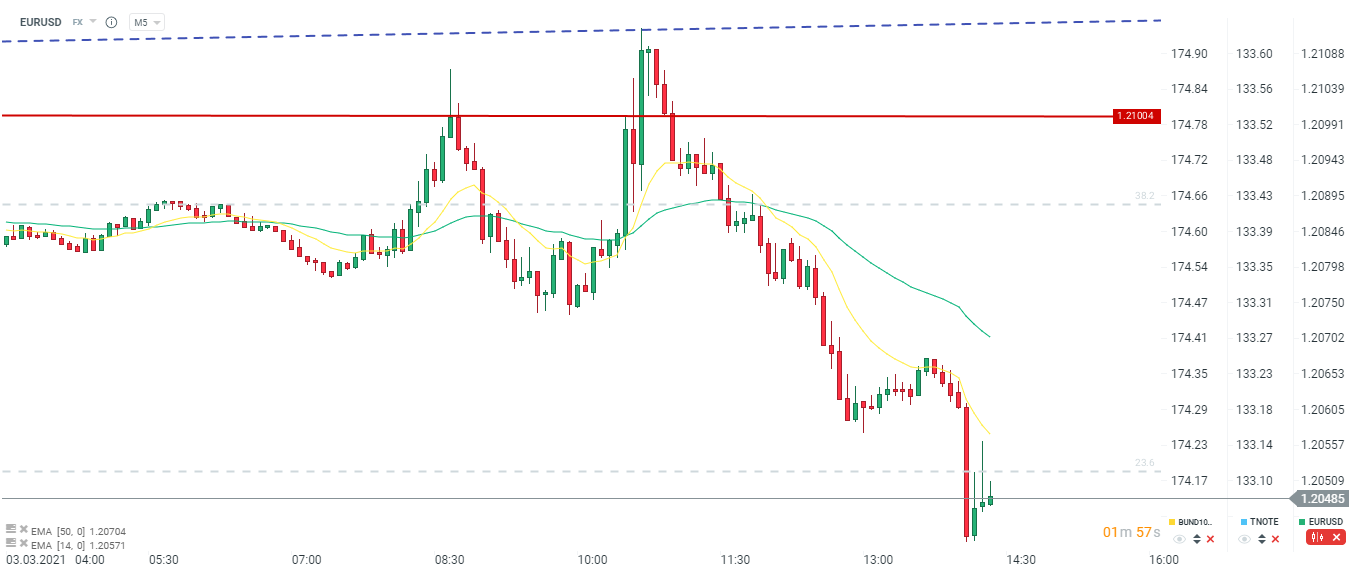 EURUSD próbuje podnosić się po danych po przebiciu wcześniej zniesienia 23.6 oraz poziomu 1,2050. Źródło: xStation5