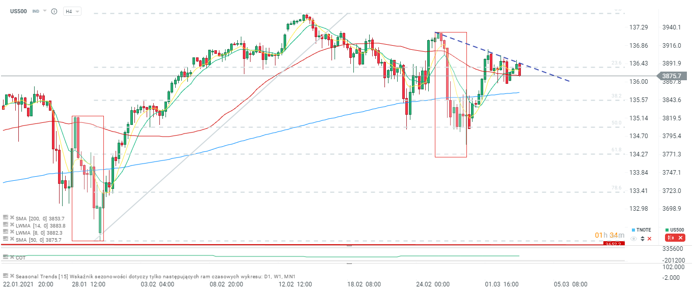 US500 nie wybija się dzisiaj powyżej spadkowej linii trendu i w odpowiedzi na słabe dane obserwujemy większe spadki, poniżej zniesienia 23.6. Testowana jest strefa między 50 oraz 200 okresową średnią na H4. Źródło: xStation5