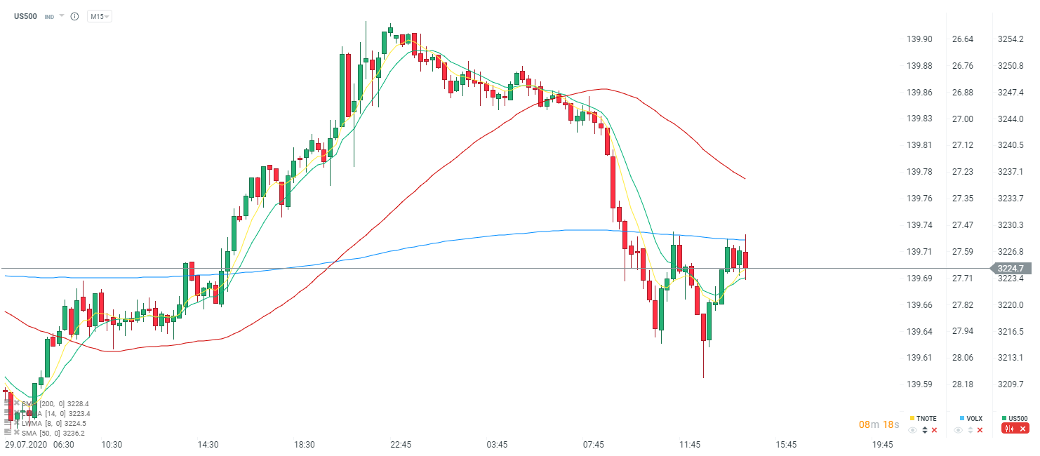 S&P 500 próbował się podnosić, ale napotkał barierę w postaci średniej 200 okresowej na wykresie M15. Warto przypomnieć, że po czerwcowym posiedzeniu Fed korekta na Wall Street sięgnęła ok. 6%. Źródło: xStation5