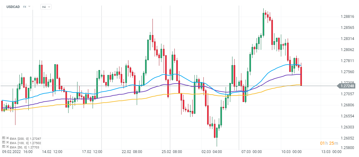 Dolar kanadyjski reaguje pozytywnie na dane z kanadyjskiej gospodarki. Para USDCAD kontynuuje ruch spadkowy. Źródło: xStation 5